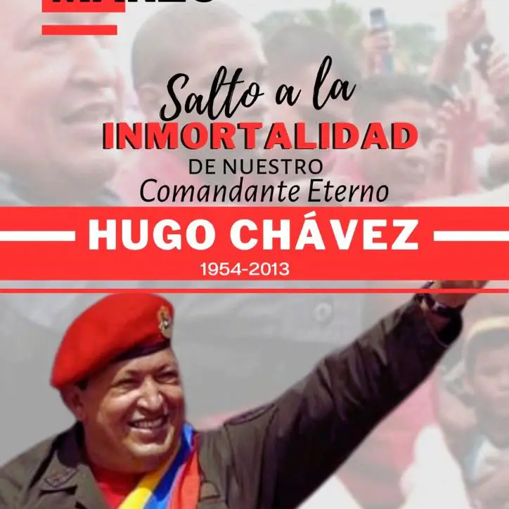 Mar52023Fecha ImportanteSin categoría Hoy 05 de marzo conmemoramos 10 años del salto a la inmortalidad de nuestro Comandante Eterno Hugo Chávez. Seguimos firmes y leales a su legado por una Venezuela Libre, Soberana e Independiente. !Chávez corazón del pueblo! Post navigationRelated PostsAFIANZANDO EL LEGADO Y LAS IDEAS DE LA REVOLUCIÓN BOLIVARIANA Y SU PADRE CREADOR HUGO CHÁVEZ, EN EL MARCO DE LOS 10 AÑOS DE SU SALTO A LA INMORTALIDAD15 de marzo de 2023Aprobación de la inclusión de la octava estrella en la Bandera Nacional, como emblema de la provincia de Guayana.9 de marzo de 2023Merida, Ciudad de los Caballeros, celebra 464 años de su fundacion.10 de octubre de 2022¡Feliz inicio de la Navidad!5 de octubre de 2022¡10 Años del Cierre Histórico de Campaña del Comandante Hugo Chávez!5 de octubre de 2022